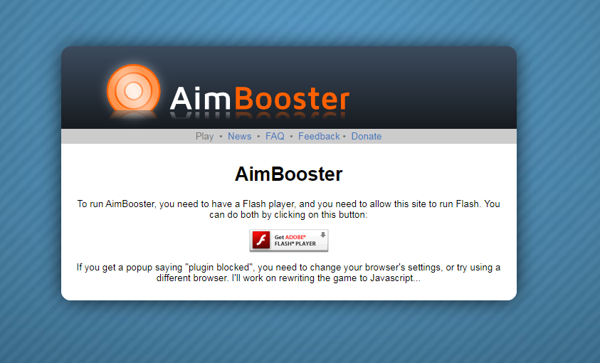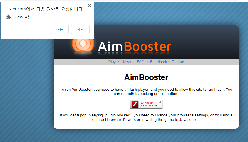 ▼ 에임연습사이트인 에임부스터를 처음 접속하시면 아래이미지와 같은 창이 뜨시는분들이 있으시고 안뜨시는 분들이 계십니다. 만약 아래와 같은 플래시 플레이어를 설치하라는 창이 뜨시면 가운데에 버튼을 눌러서 설치를 진행 해주세요.